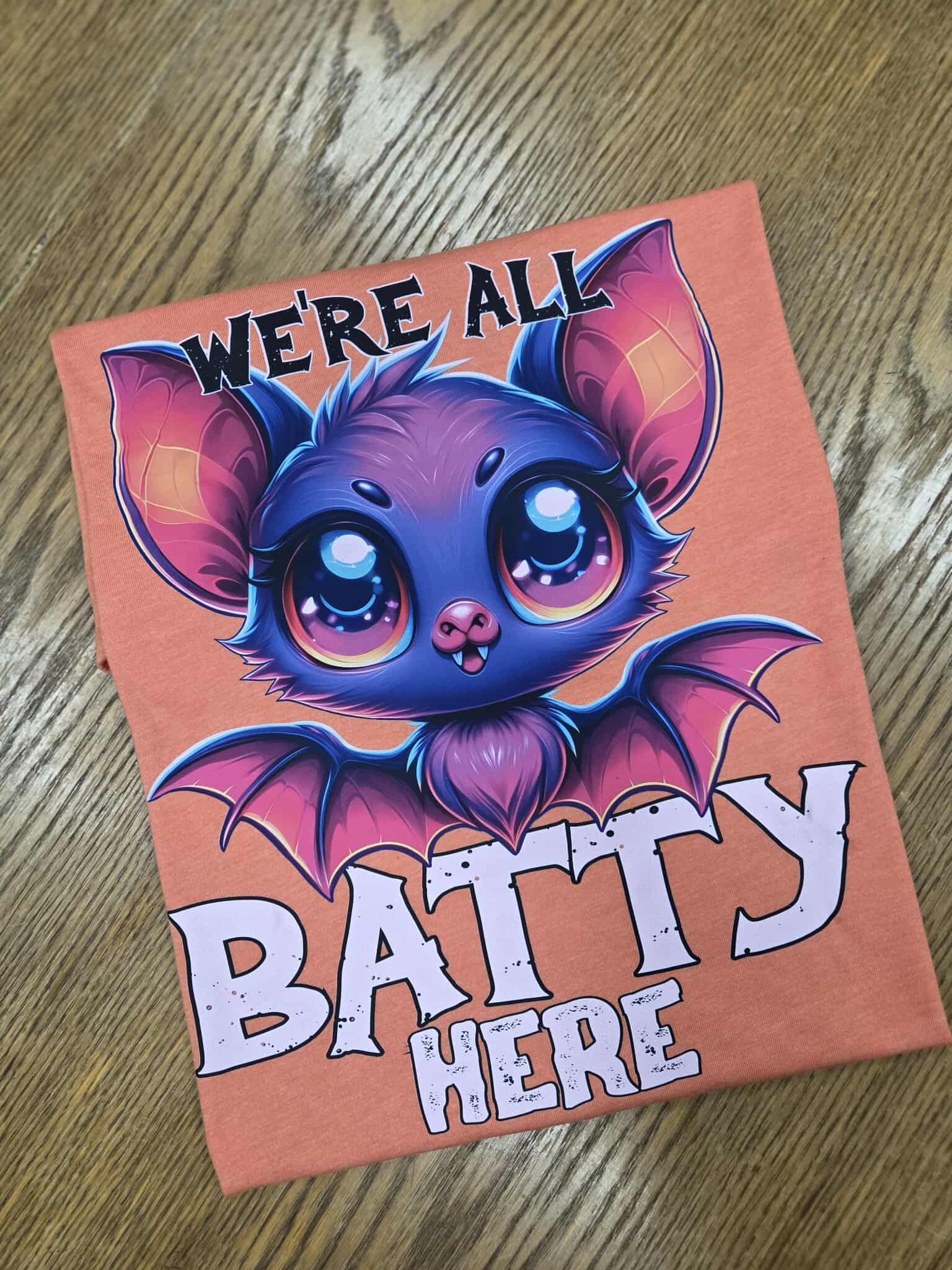 Celebrate Halloween in style with the "We're all Batty Here" Bella + Canvas tee. Featuring an adorable bat design, this playful shirt is perfect for showing off your festive spirit with a touch of whimsy. Made from soft, comfortable fabric, it’s great for trick-or-treating or cozy autumn days. Embrace your batty side and bring fun to every spooky occasion!